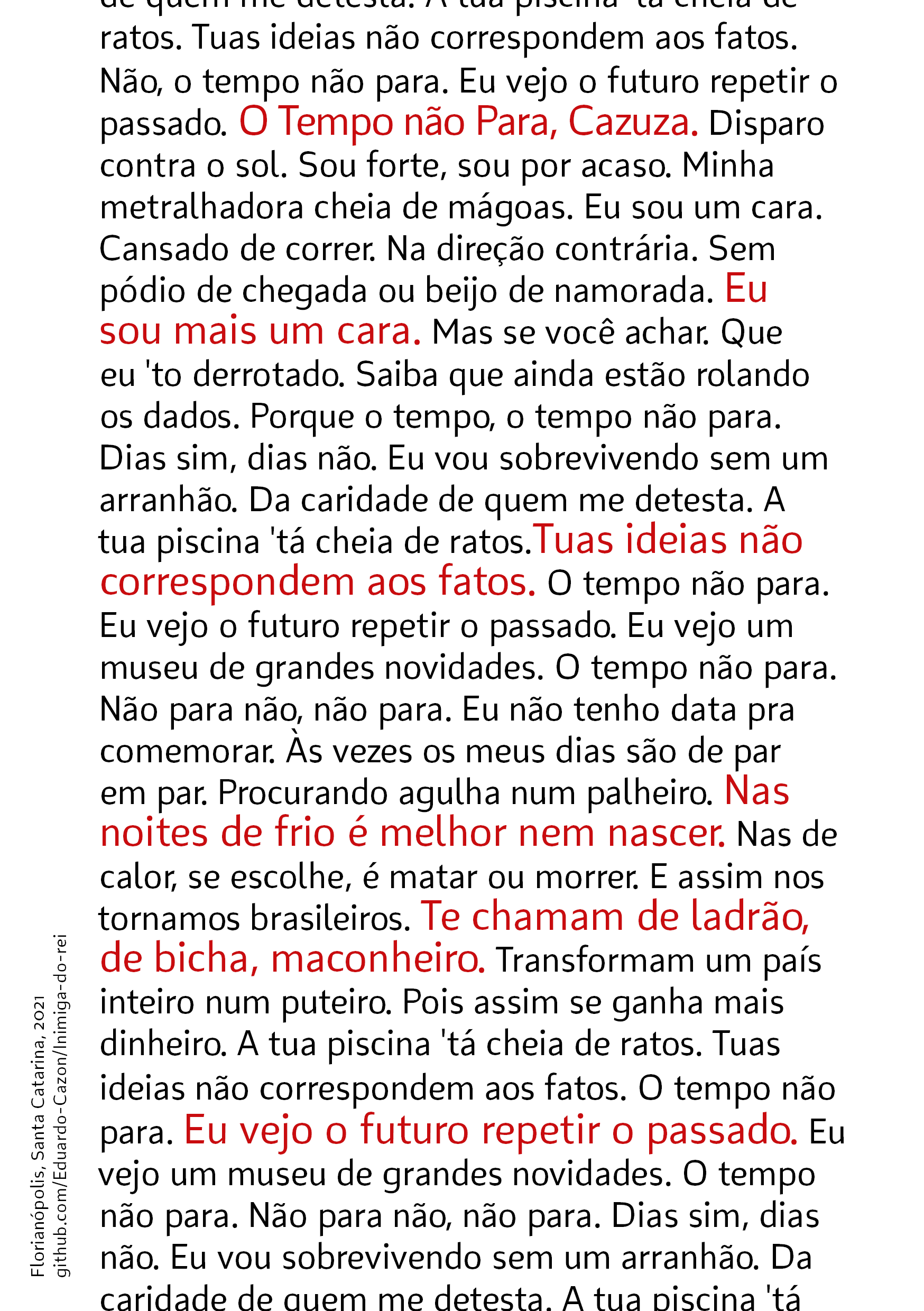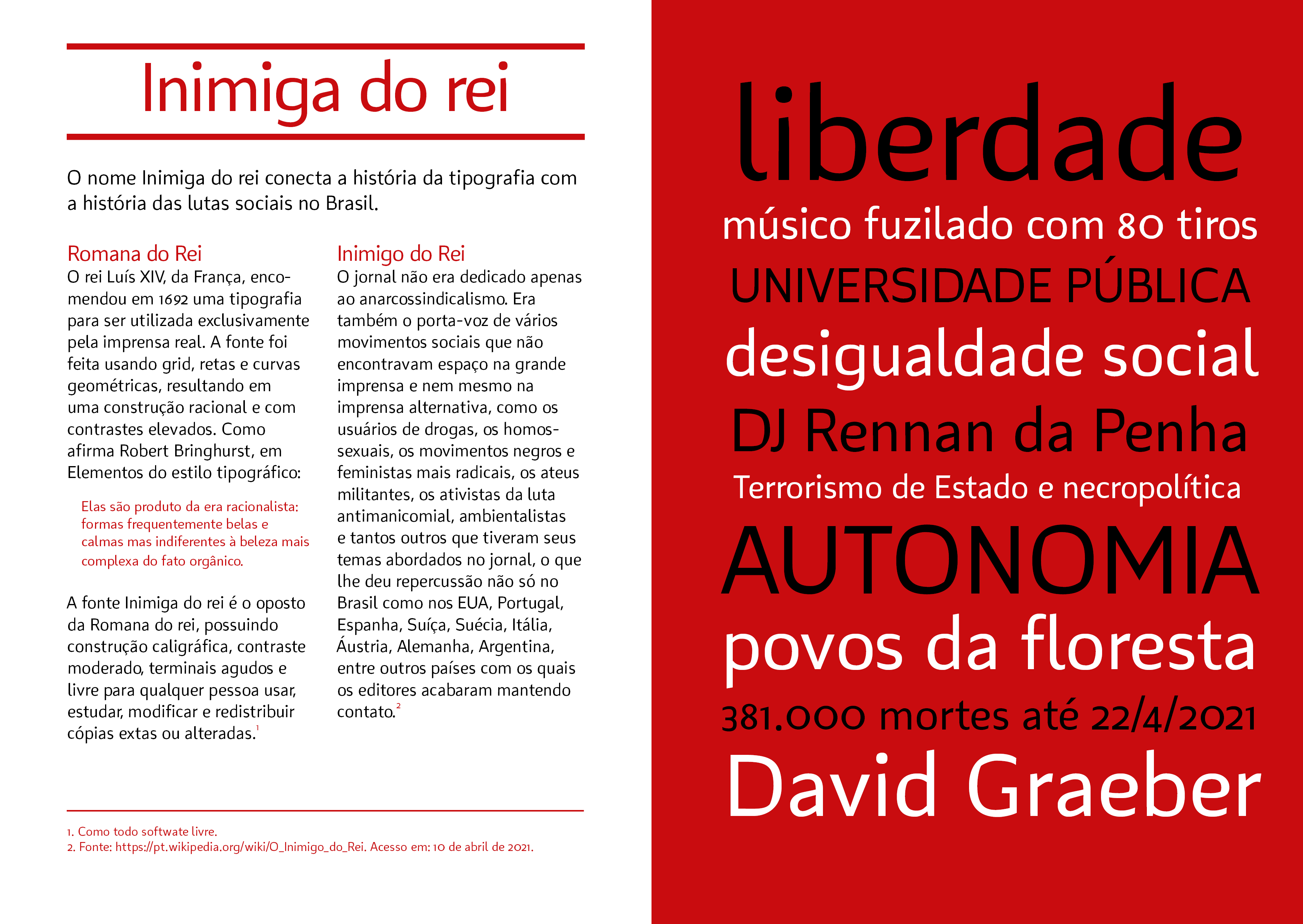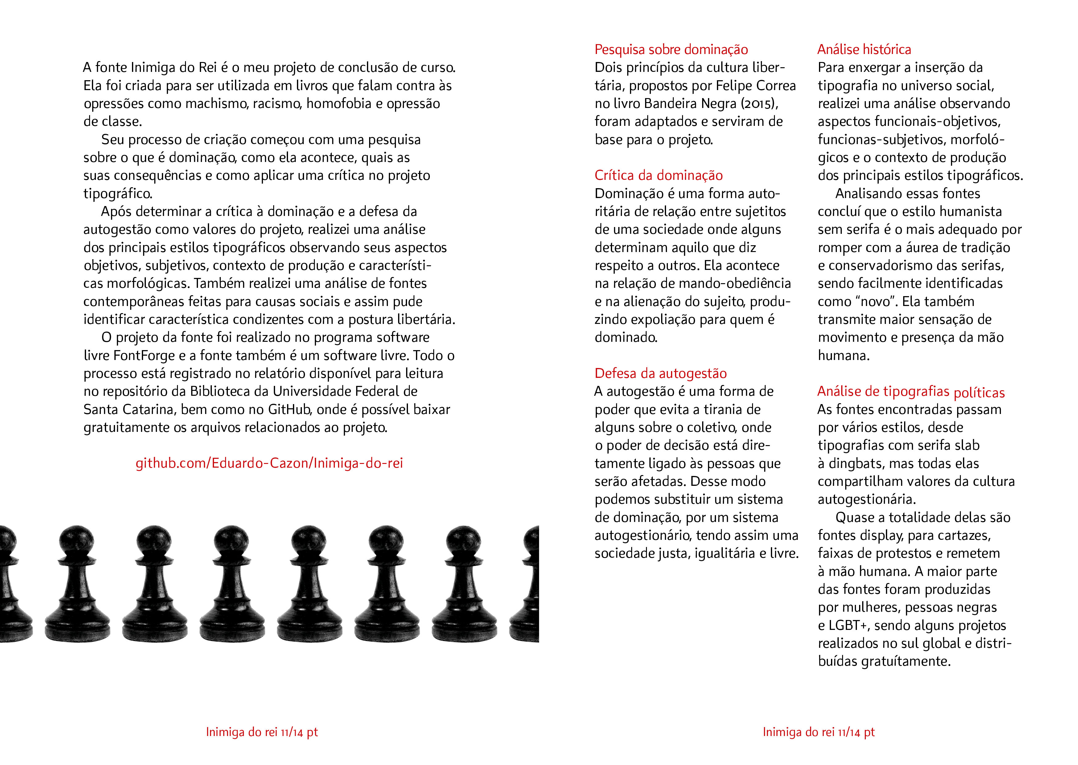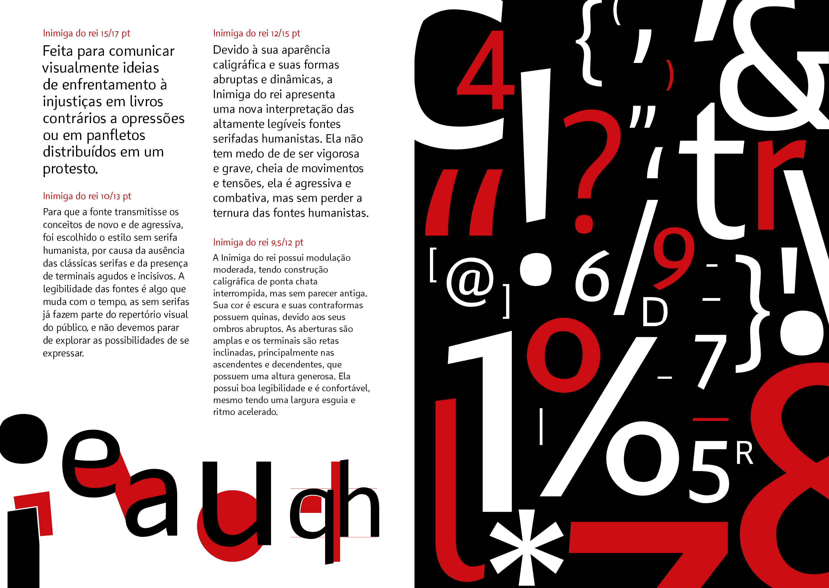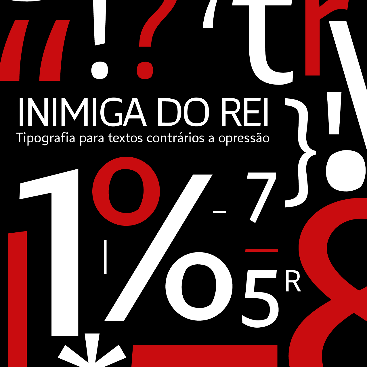 A fonte Inimiga do Rei é o meu projeto de conclusão de curso. Ela foi criada para ser utilizada em livros que falam contra as opressões como machismo, racismo, homofobia e opressão de classe. Seu processo de criação começou com uma pesquisa sobre o que é dominação, como ela acontece, quais as suas consequências e como aplicar uma crítica no projeto tipográfico. Após determinar a crítica à dominação e a defesa da autogestão como valores do projeto, realizei uma análise dos principais estilos tipográficos observando seus aspectos objetivos, subjetivos, contexto de produção e características morfológicas. Também realizei uma análise de fontes contemporâneas feitas para causas sociais e assim pude identificar características condizentes com a postura libertária. O projeto da fonte foi realizado no programa software livre FontForge.